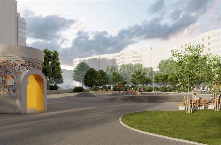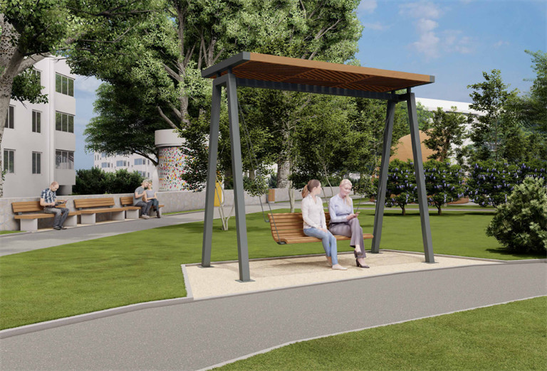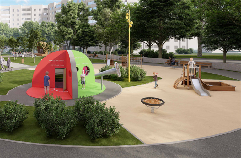 Зона отдыха обзаведётся парковыми скамейками и накладными сиденьями на существующей стене. На детской площадке появятся игровой комплекс, научная локация "Природа света" и маятниковые качели. В тени разместят качели-диваны и шезлонги-шестигранники.