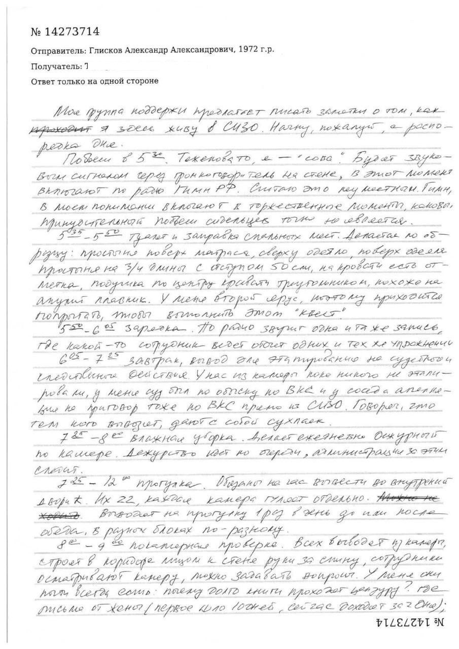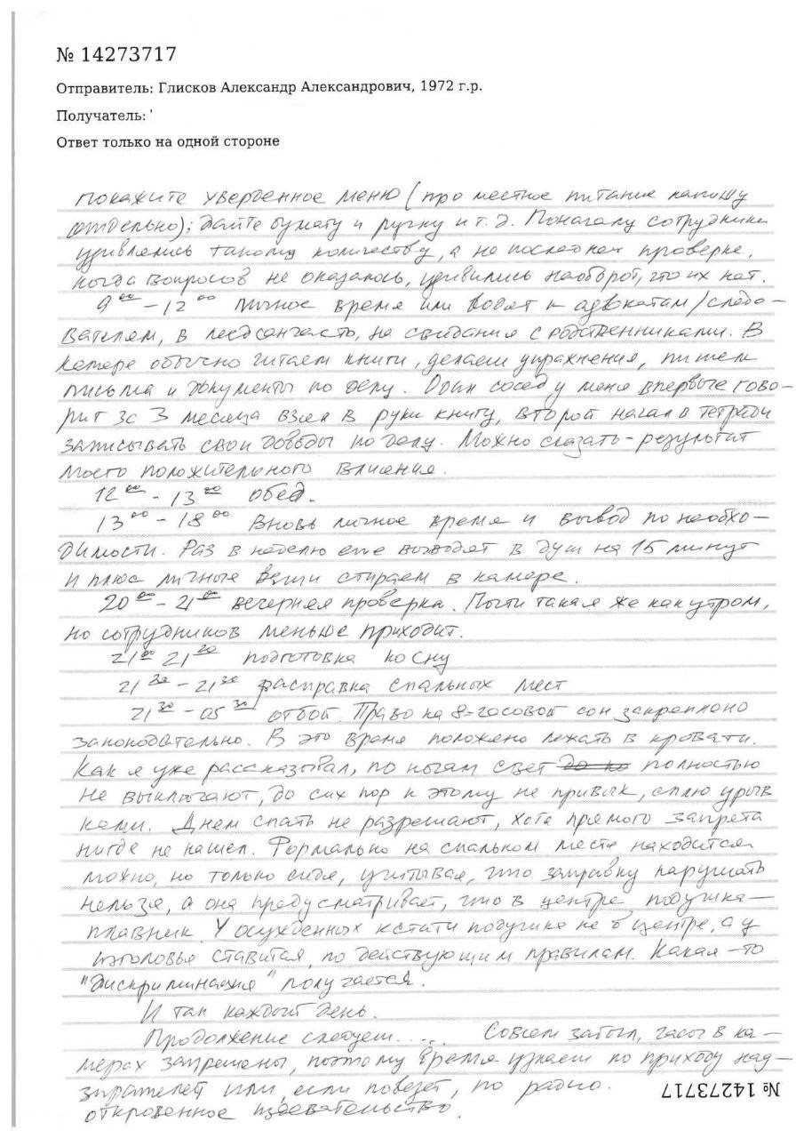 Арестованный депутат Законодательного Собрания Красноярского края от ЛДПР Александр Глисков написал новое письмо. В нём он рассказал о распорядке дня в СИЗО.