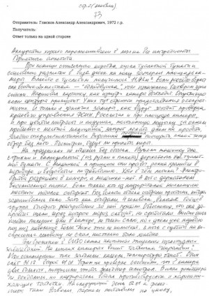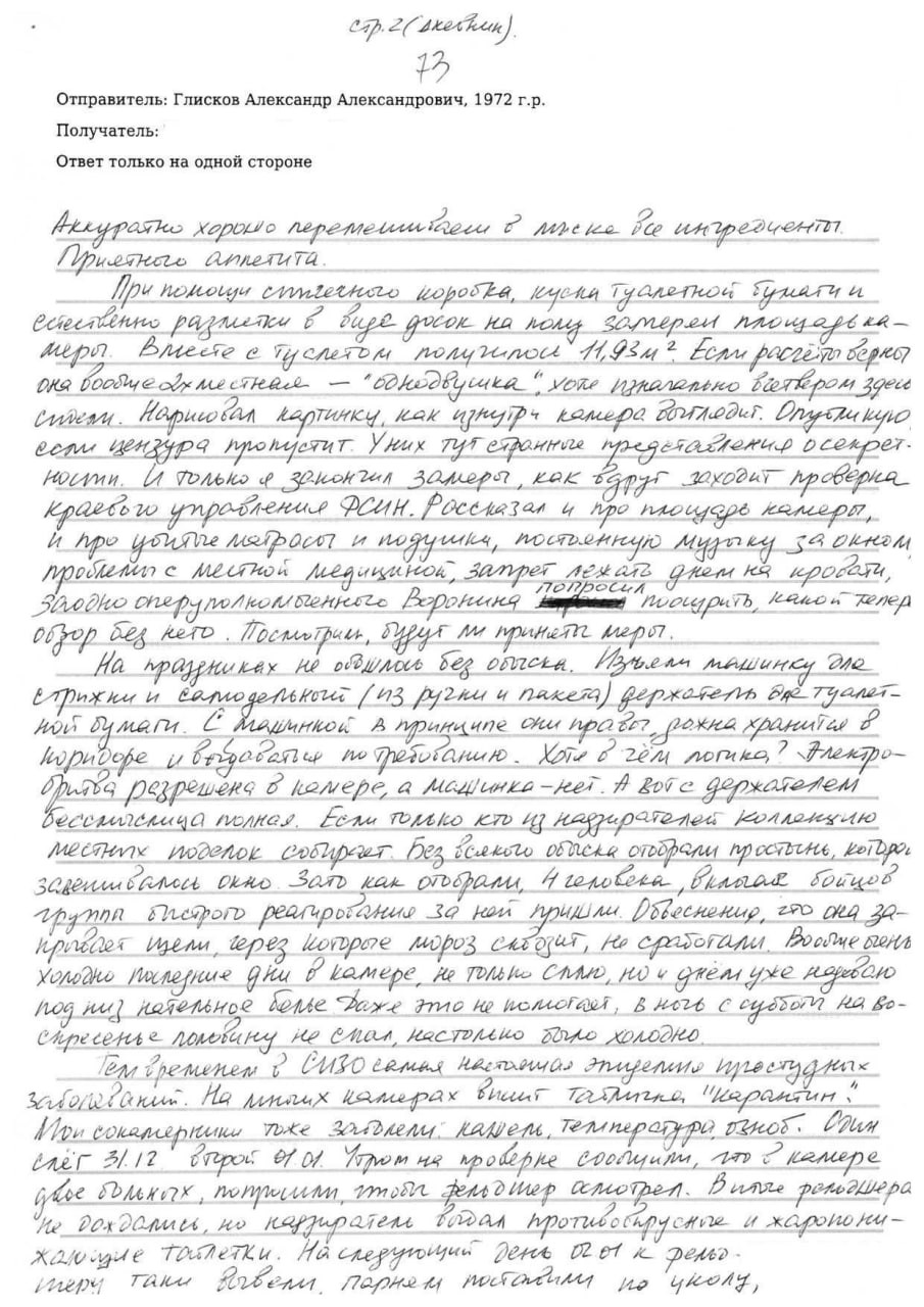 "В среду утром и вечером подходила фельдшер померить температуру, на просьбу дать таблеток от кашля сказала: "Закончились". Именно в этот день был обыск, что больные в камере, никого не смутило. Четверг: фельдшера не было, сотрудник принёс одну таблетку на двоих без названия. В пятницу отвели нас всех в медсанчасть, был уже врач, температуры у парней нет, главная проблема - кашель. Выдали антибиотик, таблетки от кашля и от воспаления в горле. Заодно меня осмотрели, тоже к тому времени начал кашлять, получил за компанию таблетки полоскать горло. А вечером перед отбоем сокамерникам приказ - с вещами на выход. Сижу вторые сутки один, гадаю, что это было. То ли мою камеру перевели в одиночный режим, то ли, как здесь принято, раз в месяц перетасовывают людей по камерам. Наверное, не очень это правильно, когда они болеют", - говорится в письме Глискова.