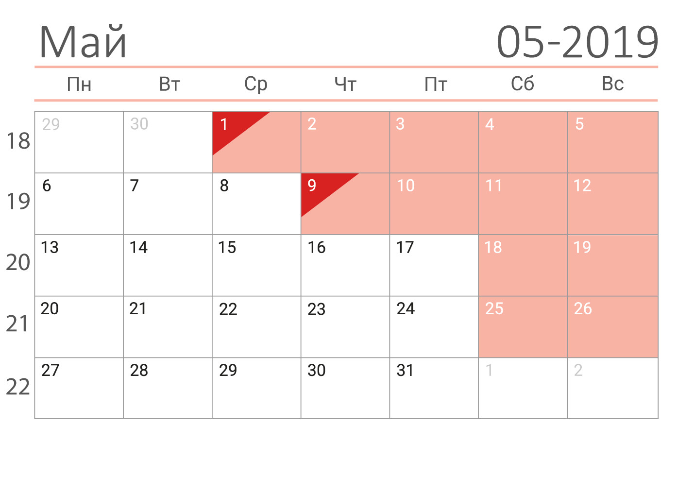 В связи с тем, что 30 апреля и 8 мая являются рабочими предпраздничными днями, их продолжительность сокращается на один час.