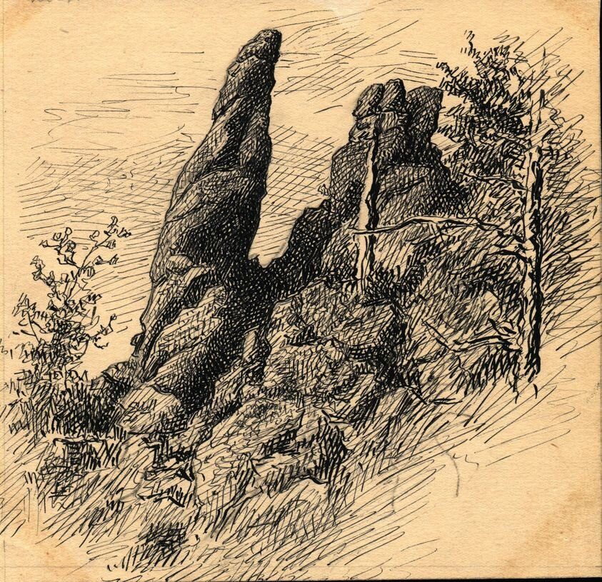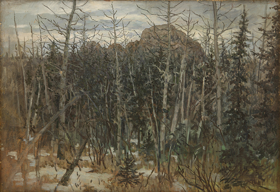 Столбы, очевидно, и стали первыми "персонажами" каратановских холстов. Во всяком случае, среди нескольких сохранившихся этюдов 1909-1910 годов больше всего - с изображением скал и тайги: "Столбы. Камень", "Столбы. Летний день", "На Столбах".