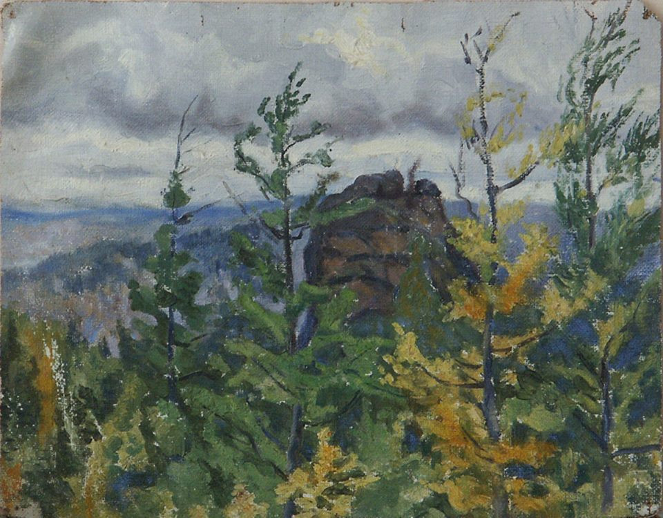 Сиенитовый камень в окружении зелени - один из его любимых этюдных мотивов. Причудливые каменные глыбы, разбросанные по тайге силой природной стихии, притягивали внимание мастера, удивляли своей выразительной мощью. Он писал Столбы и летом, и глубокой зимой, и в золотом осеннем уборе.