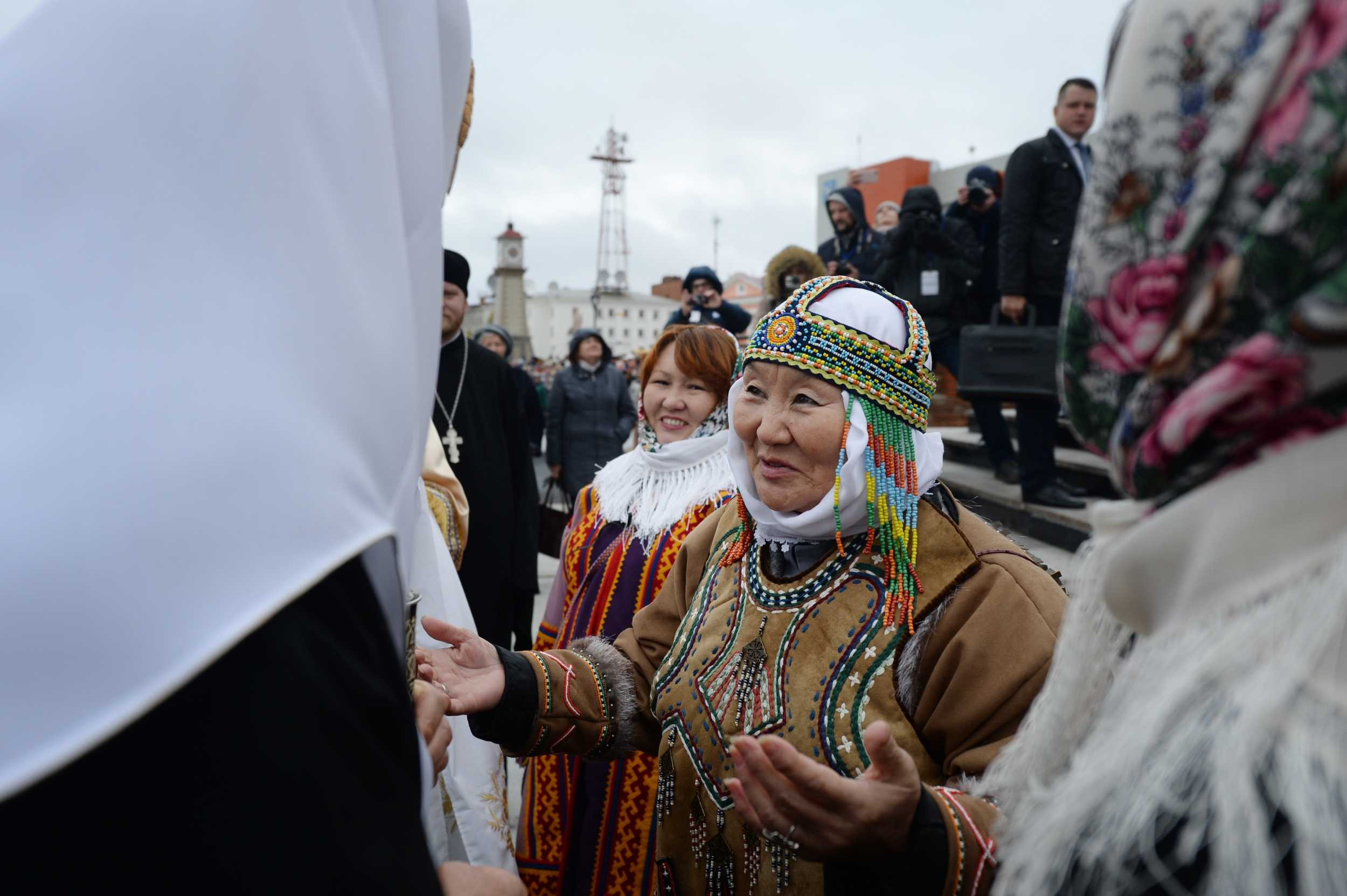 На площади у храма его приветствовали дети из группы «Чоргуячи», действующей при Таймырском Доме народного творчества, в национальных костюмах народов Таймыра.