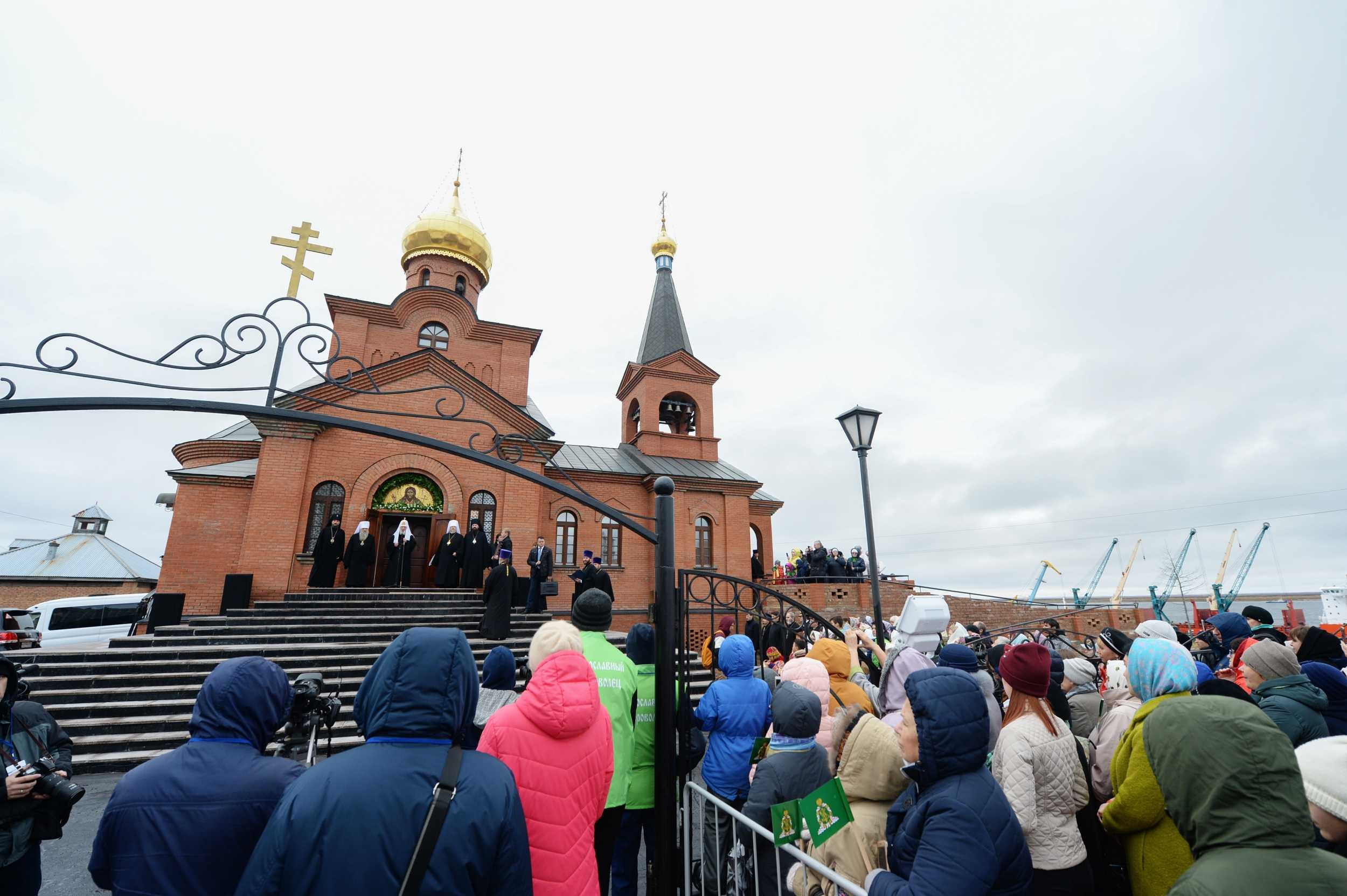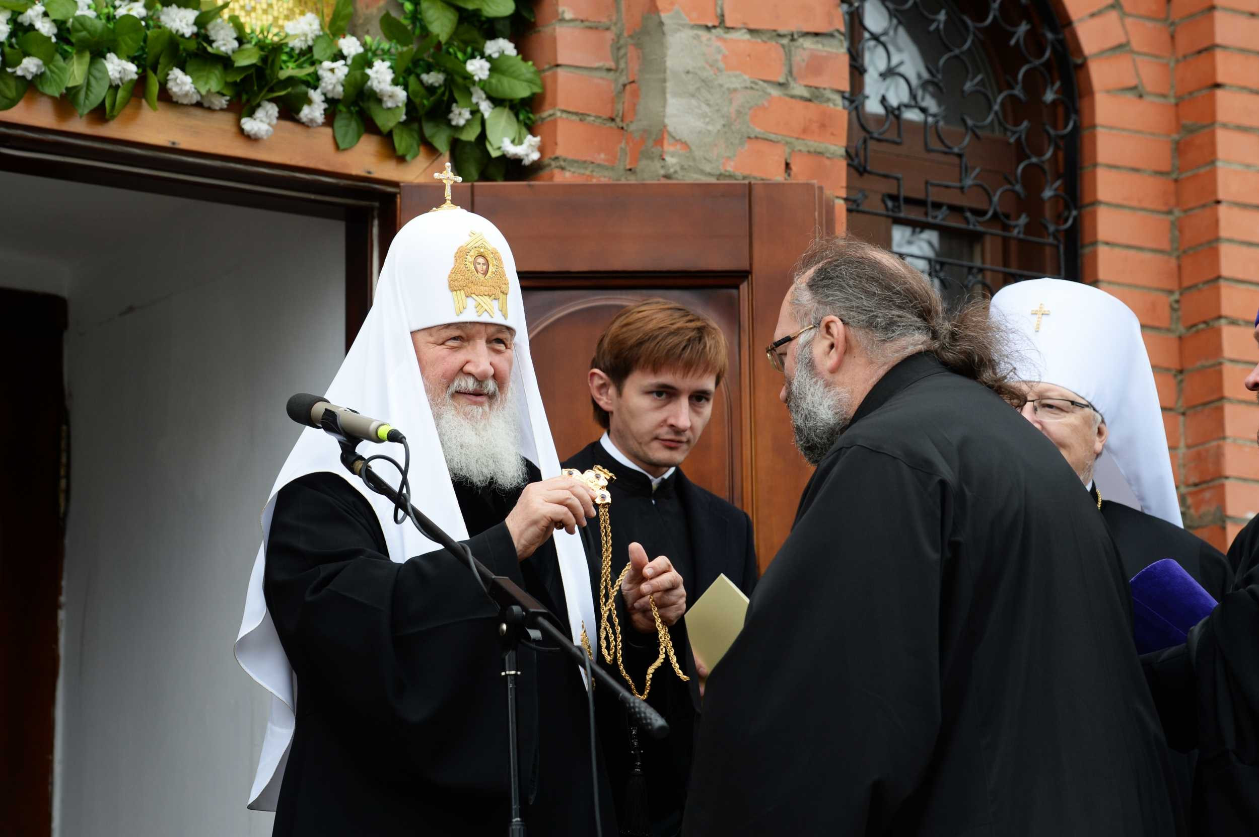 Патриарх Кирилл со ступеней храма обратился к собравшимся с Первосвятительским словом. В дар храму он передал икону Божией Матери «Умиление».
