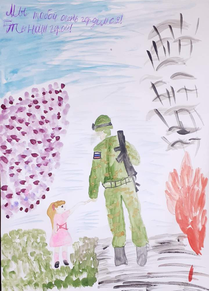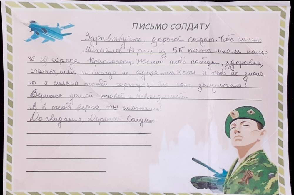 «Привет, дорогой наш, любимый солдат! Пишет тебе Кира из Красноярска, мне 10 лет. Я очень благодарна тебе за то, что защищаешь нашу Родину и нас. Ты очень сильный и бесстрашный! Я хочу, чтобы все солдаты были такими же храбрыми. Я очень горжусь Вами! Знайте, что мы вас любим и скучаем, и ждём домой с Победой! Я очень бы хотела сказать тебе прямо в глаза: «Спасибо за мир! Спасибо что я есть!». Берегите себя! Храни Вас Бог!