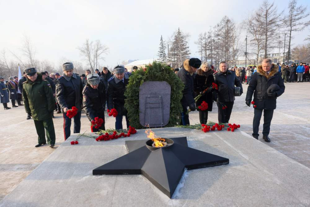 Возле Мемориала Победы состоялась церемония зажжения Вечного огня и возложения цветов. В ней приняли участие ветераны Великой Отечественной войны и специальной военной операции, представители законодательной и исполнительной власти Красноярского края и города Красноярска, представители силовых структур, молодёжных общественных организаций и жители края.