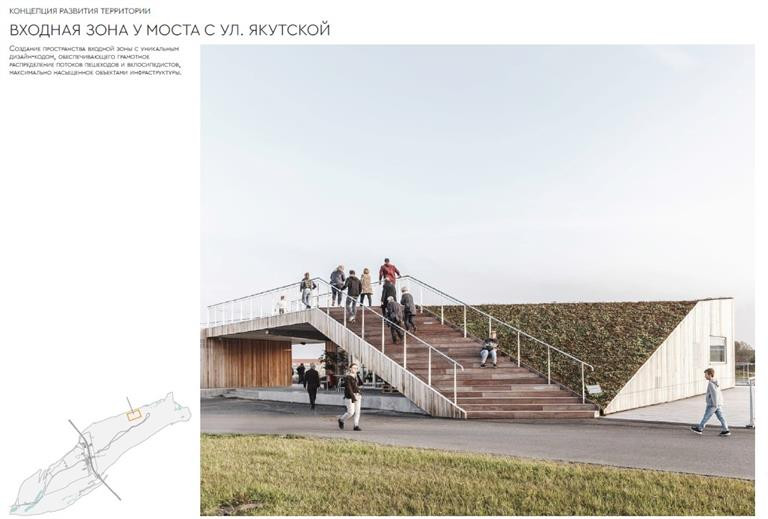 Благоустройство коснётся в большей части восточной стороны острова Татышев, где планируется построить велопешеходный мост, который соединит общественное пространство с улицей Якутской, и новую входную группу на территории острова. Здесь появятся смотровые площадки, развлекательные, спортивные и инфраструктурные объекты.