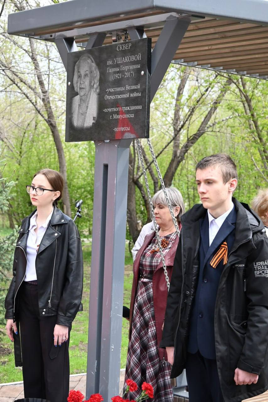 Галина Георгиевна Ушакова - выдающаяся жительница посёлка, поэтесса, ветеран Великой Отечественной войны и Почётный гражданин Минусинска. Открытие сквера её имени стало замечательным подарком зеленоборцам к 80-летию Победы.
