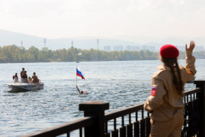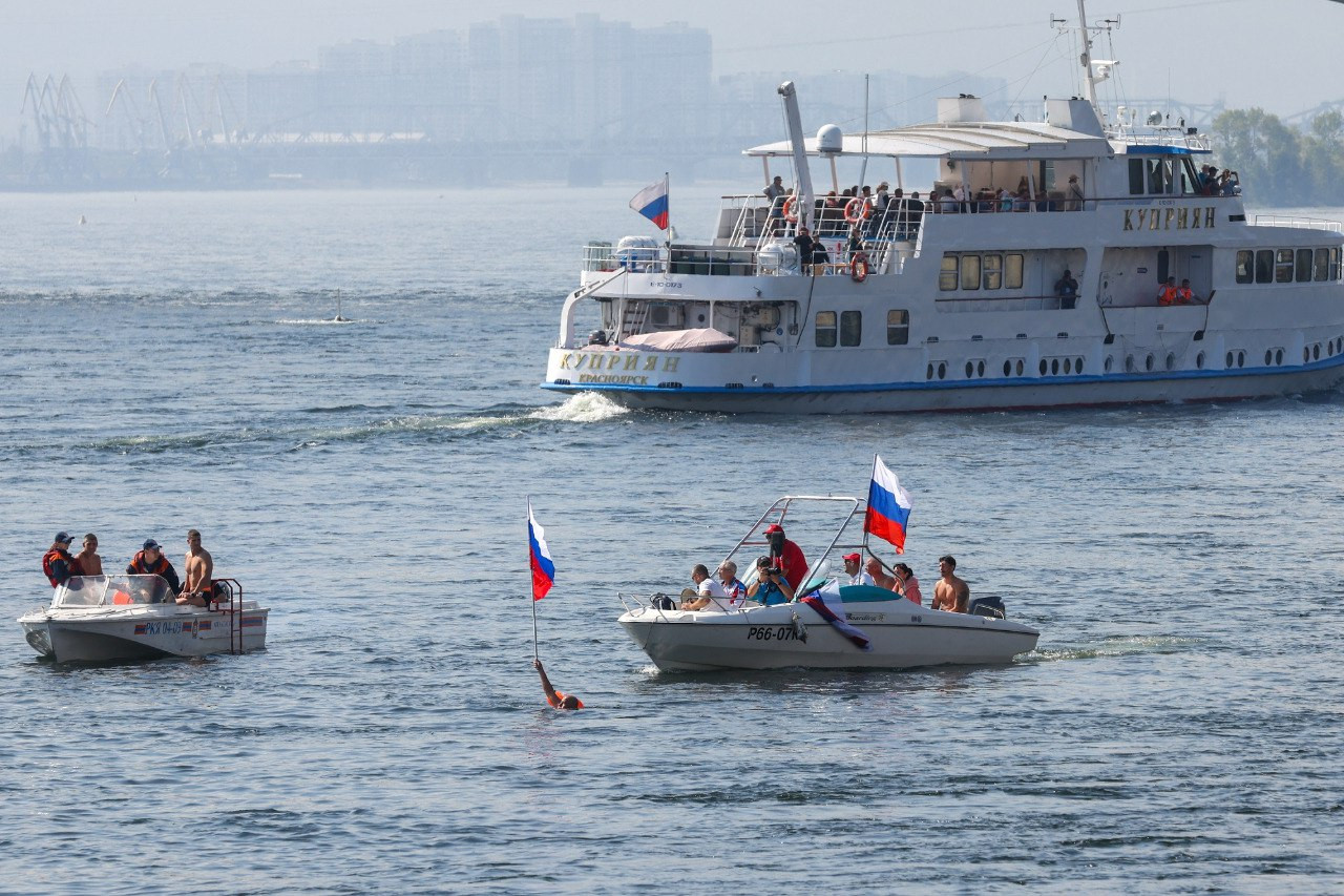 В Красноярске состоялся 3-километровый заплыв по Енисею с российским флагом