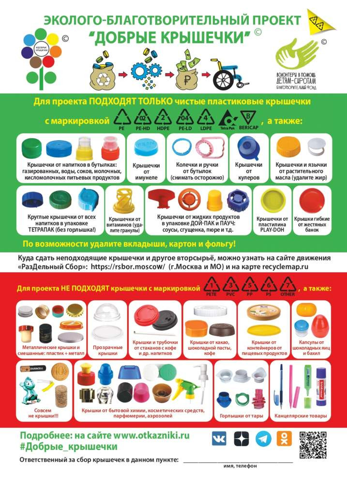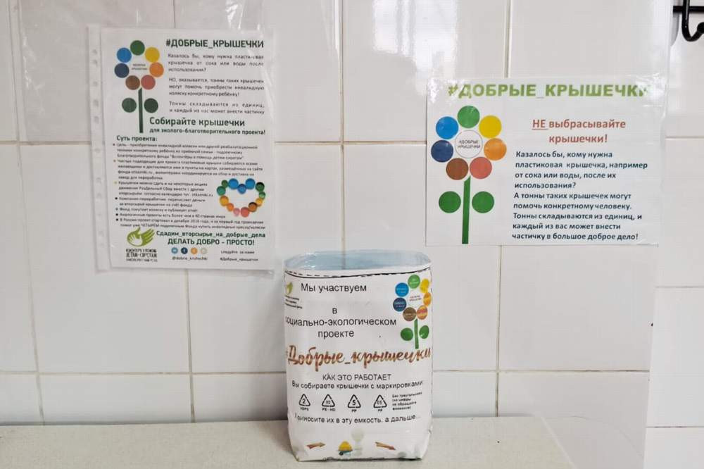 Для сбора пластиковых крышек от тары из-под пищевых продуктов в исправительном учреждении в местах общего пользования сотрудники установили специальные ёмкости с информационной памяткой о задачах акции и правилах сбора. Накопление «сырья» осуществляют совместными усилиями сотрудников, их семей и осуждённых.