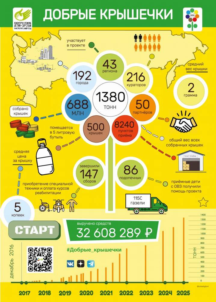 Крышки передают представителям благотворительного фонда «Волонтёры в помощь детям-сиротам» для транспортировки в Красноярск на пункт приёма и дальнейшей передачи на завод по переработке пластика. Вырученные деньги идут на приобретение реабилитационной техники и жизненно необходимого оборудования для нуждавшихся детей.