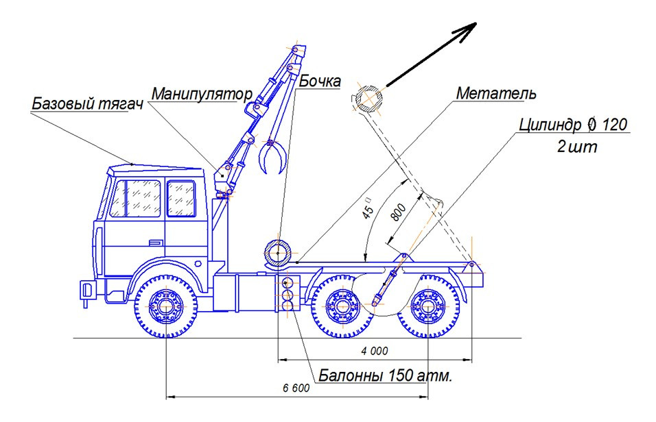 Заряд зажигается нажатием кнопки запального устройства, крюк от-крывается электропневмоклапаном, катапульта срабатывает поворотом её рамы на 450 и бочка летит на затор.