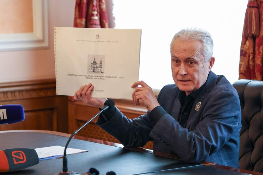 Член наблюдательного совета фонда поддержки строительства и развития кафедрального собора, Почётный архитектор России Константин Шумов и главный архитектор проекта, руководитель авторского коллектива воссоздания собора Александр Банников рассказали об истории строительства, предполагаемых сроках работ и планах благоустройства прилегающей территории. В качестве примера была приведена набережная у монастыря Успения Пресвятой Богородицы - одна из самых благоустроенных в Красноярске.