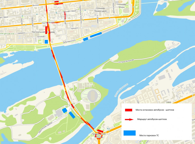 Специально к игре администрация города запустит шаттлы для болельщиков. За два часа до начала футбольного матча, а также после игры в течение полутора часов будут курсировать два бесплатных автобуса, которые будут перевозить пассажиров по маршруту: Предмостная площадь – Коммунальный мост – ул. Карла Маркса – ул. Сурикова – ул. Ленина – ул. Вейнбаума – Коммунальный мост – Предмостная площадь.