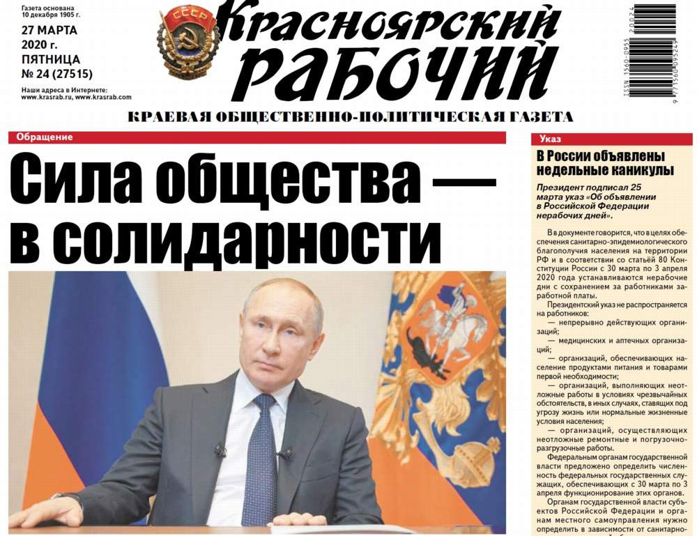 О чём пишет "Красноярский рабочий" в пятницу, 27 марта 2020 года