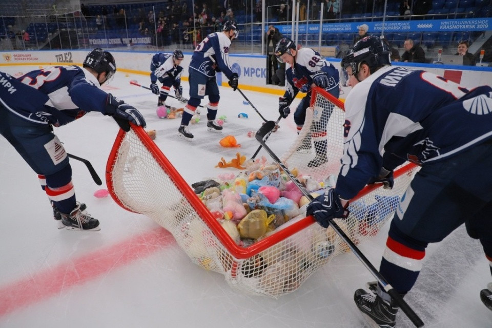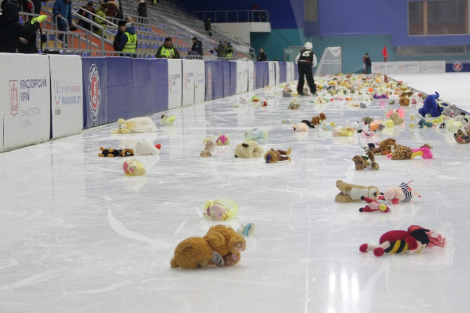 В Рождество в Красноярске прошли два хоккейных матча, накануне которых болельщикам предложили купить или принести из дома любую мягкую игрушку и по окончании матча после сигнала бросить её на лёд.
