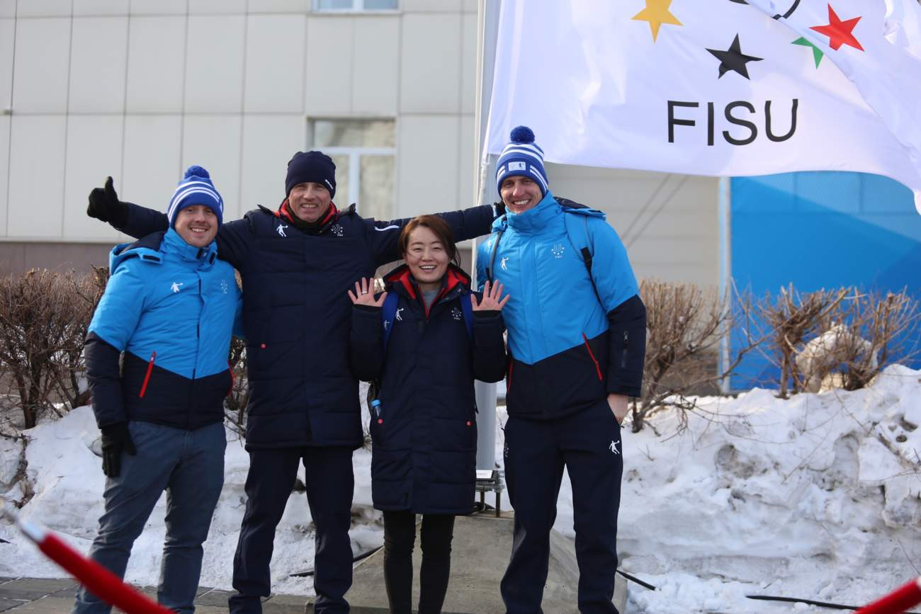 Под гимн России, принимающей Зимнюю универсиаду-2019, и студенческий гимн «Гаудеамус» состоялось поднятие флагов России и Международной федерации студенческого спорта.