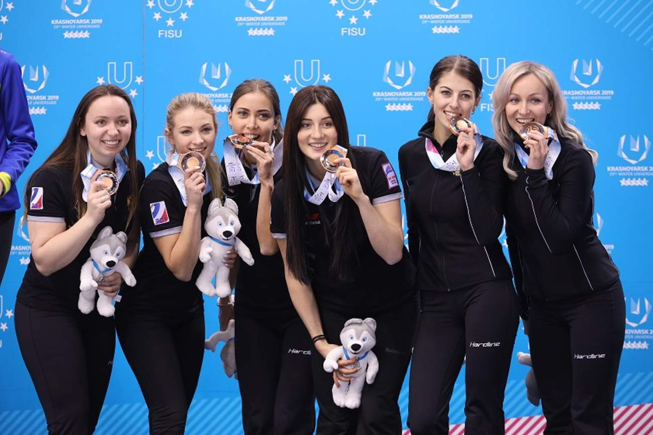 В матче за бронзу встретились сборные России и Великобритании. Уже в первых двух эндах россиянки укрепили свои позиции, взяв сразу 5 очков. В третьем энде британки в ответ взяли 2 очка, но в следующем раунде решающим броском Марии Комаровой сборная России вновь увеличила разрыв в счете до 5 очков. Великобритания не сдавалась, но и мощной игре россиянок ничего противопоставить не могла. Со счетом 12:5 выиграли хозяйки Зимней универсиады-2019 и завоевали бронзовые медали.