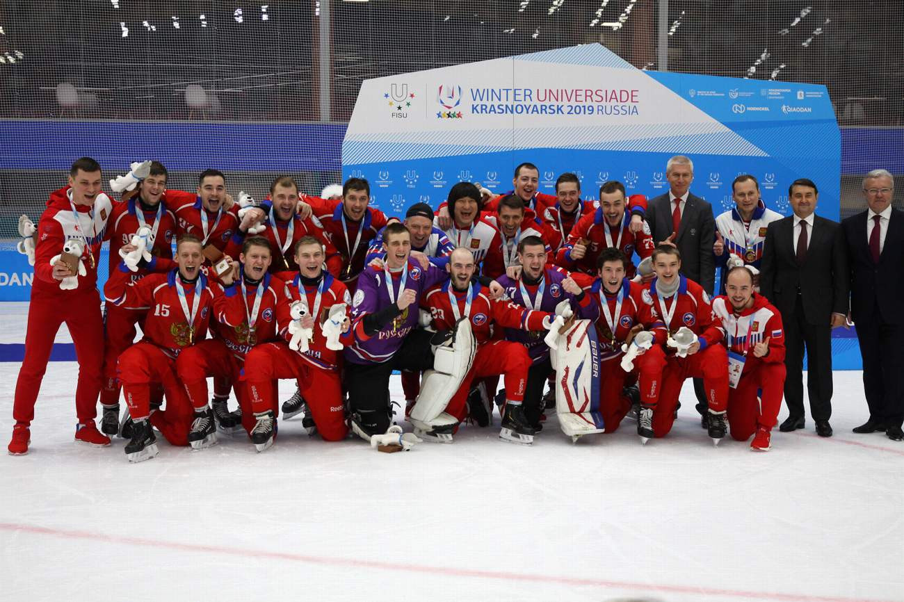 Первое в истории Студенческих игр золото мужского турнира по хоккею с мячом завоевала сборная России. Сергей Ган с 13 мячами стал лучшим бомбардиром Зимней универсиады-2019.