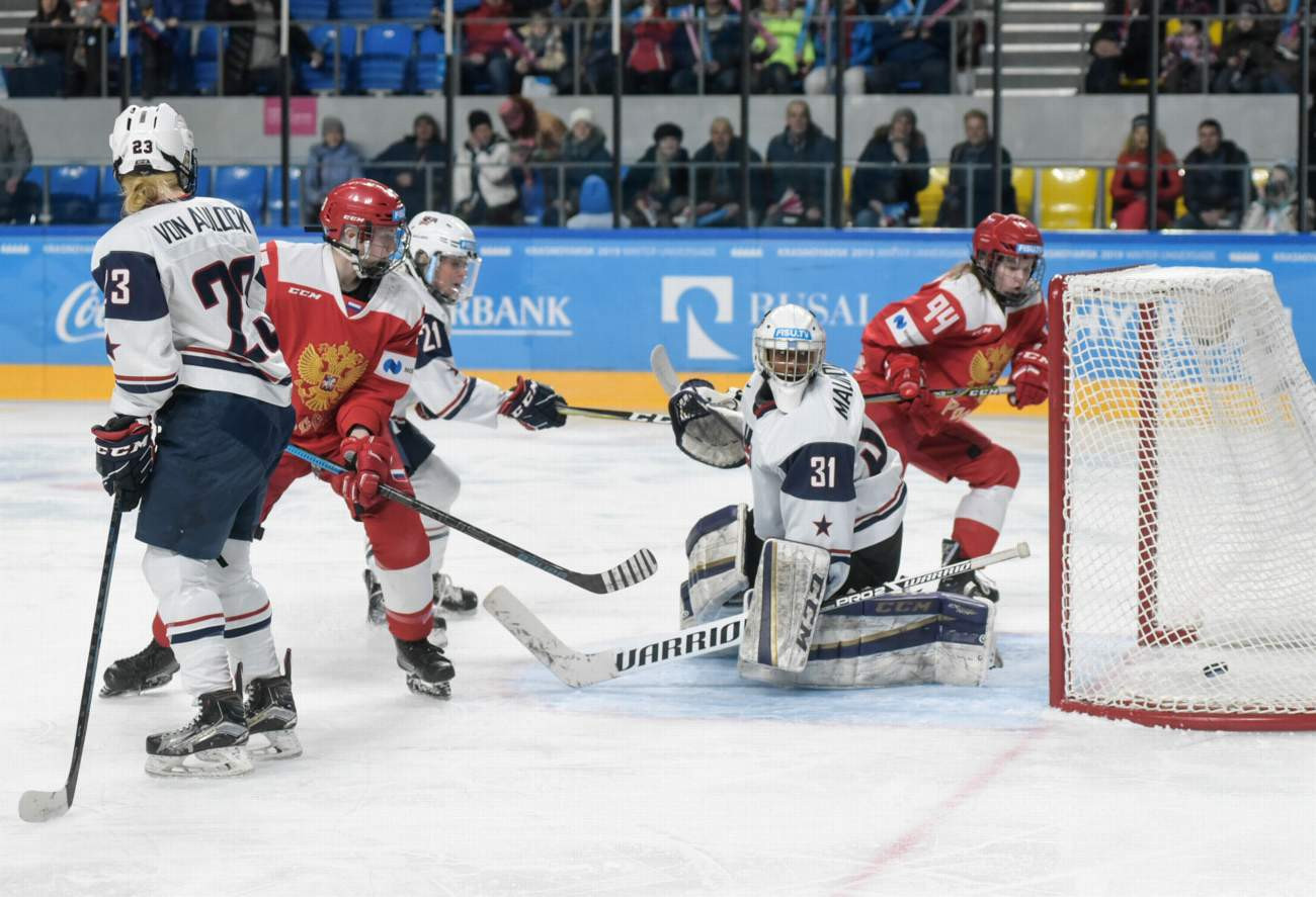 Сборная России и в полуфинале нанесла крупное поражение команде США. Уже к середине первого периода в воротах американок оказалось три шайбы. Замена в воротах Жазмин Малиновски на Ханну Стоун немного усложнила игру российских хоккеисток, но к перерыву Валерия Павлова забросила четвертую шайбу, при этом записав на свой счет хет-трик.