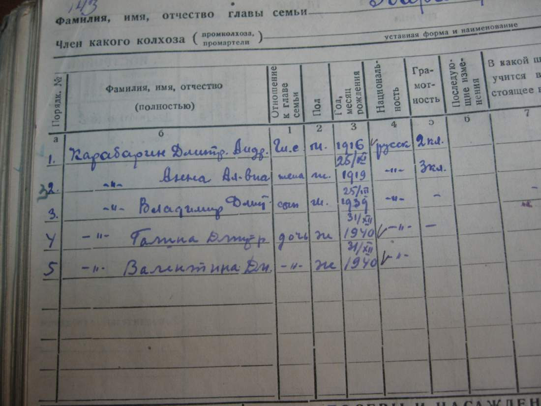 В подавляющем большинстве своём записи свидетельствовали о крестьянском роде деятельности наших предков. Мой прапрадед Василий Иванович Карабарин умер 7 декабря 1907 года будучи именно крестьянином.