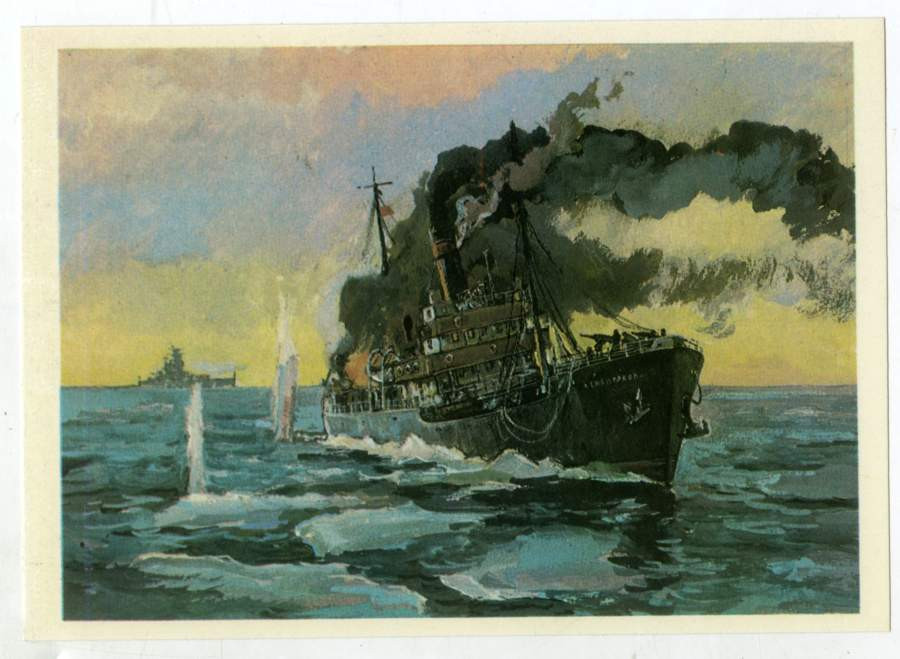 Немцы, догоняя пароход "Александр Сибиряков", запрашивали информацию о ледовой обстановке. Поняв, что план не сработал, они стали ставить помехи и глушить радиосообщение "Александра Сибирякова" с Диксоном. Над крейсером "Адмирал Шеер" был поднят немецкий военно-морской флаг и передано сообщение с требованием лечь в дрейф.