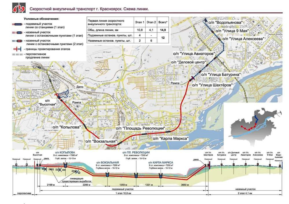 Из представленных на суд общественности материалов можно понять, что участок первой линии внеуличного транспорта Красноярска будет являться метротрамом на участке от Высотной до Шахтёров, а также скоростным трамваем на участках Бугач - Высотная и Шахтёров - Водопьянова.