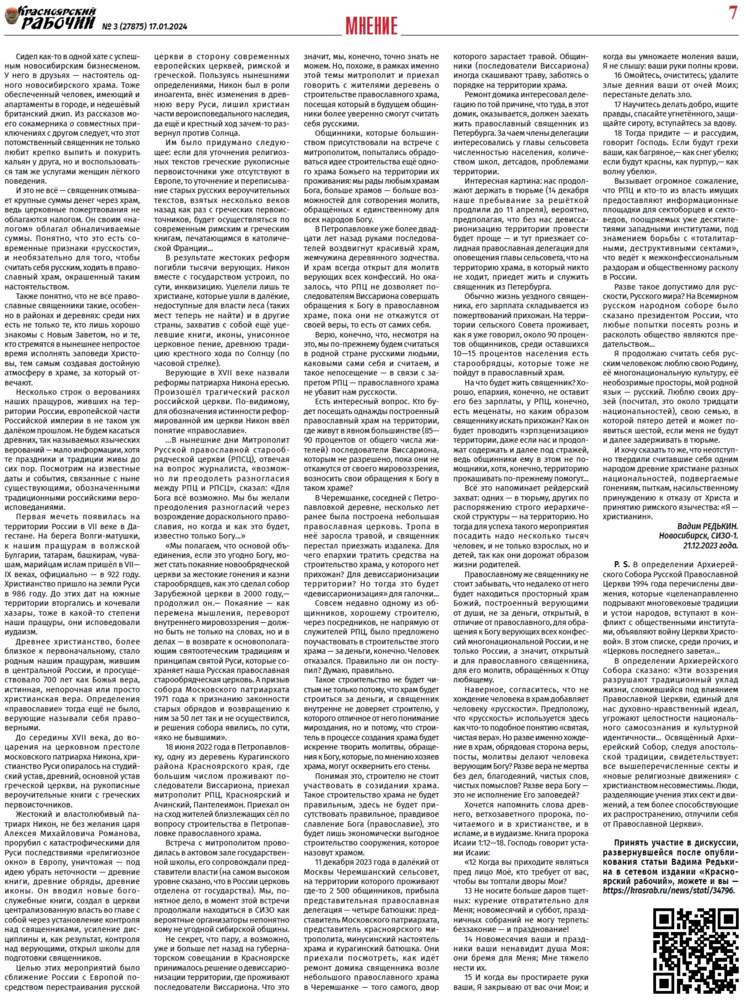 Со своей стороны мы читатели предупреждаем редакцию о недопустимости публиковать экстремистские статьи подследственного Редькина Вадима,в которых оный унижает достоинство православной веры,которая есть основная в России, как по количеству входящих в нее людей,так и по времени развития оной в России.