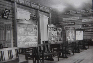На одном из снимков -- кинотеатр внутри. На стене под лозунгом "Новые звуковые фильмы советской кинематографии" -- реклама фильмов 1937--1939 годов, на деревянных щитах -- фотографии, в фойе висят портреты И. Сталина и М. Калинина, стоят скамейки для зрителей, которые перед сеансами слушали музыку.