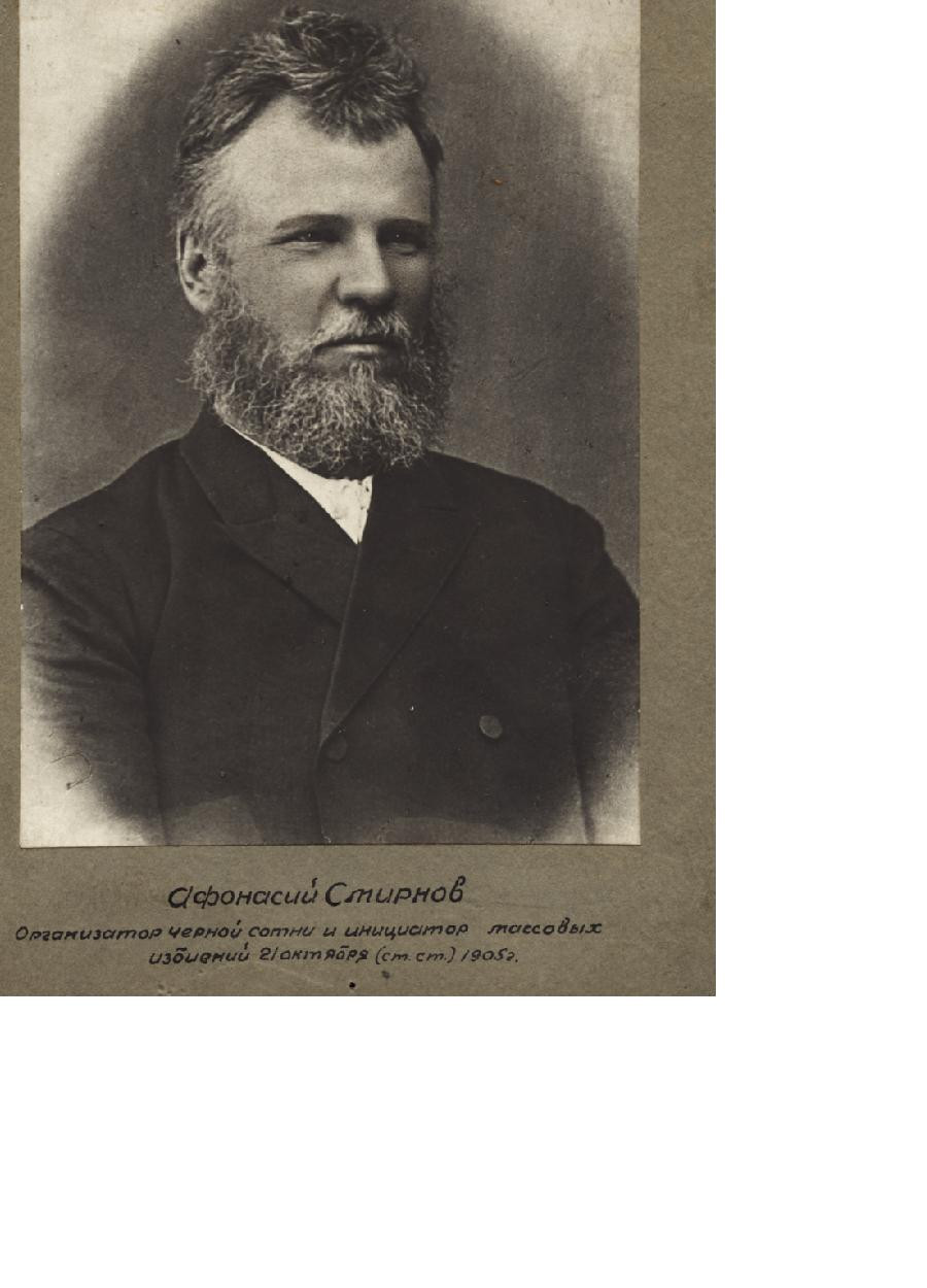 Смирнов Афанасий Григорьевич – надворный советник, заседатель окружного суда, преподаватель гражданской истории. Кандидат богословия - Красноярская духовная семинария. Руководитель союза «За волю, Царя и отечество». После окончания Томской духовной семинарии работает преподавателем русской гражданской истории Красноярской духовной семинарии. Однако больше он был мирским человеком, патриотом, создателем и руководителем «Союза мира и порядка» членов которого называли «черносотенцами», а также владельцем конного завода. В его доме, где сейчас находится поликлиника (Мира- 9-го января), располагалась первая в Красноярске телефонная станция. Во время митинга, проводимого большевиком Урицким и его товарищами 21 октября 1905 года в Народном доме (театре Пушкина), А.Г. Смирнов поднял народ на его разгон, который сопровождался применением оружия. Из организаторов митинга 11 человек было убито, двенадцатый (Урицкий) сбежал. Афанасий успел его штакетиной раз 5 по спине ударить, но тот оказался быстрее. Через месяц Афанасия подстрелили в тёмном переулке (пуля пробила бедро и перебила кость, идти он не мог), при этом сказали «Это тебе за Урицкого». Когда его подобрали, Афанасий сильно замёрз и через месяц скончался от воспаления лёгких. Сыну Афанасий как-то сказал- Меня антисемитом обзывают, а у меня в организации ДВА еврея, конечно крещёные Кто ж знал, что митингующие все евреями оказались.