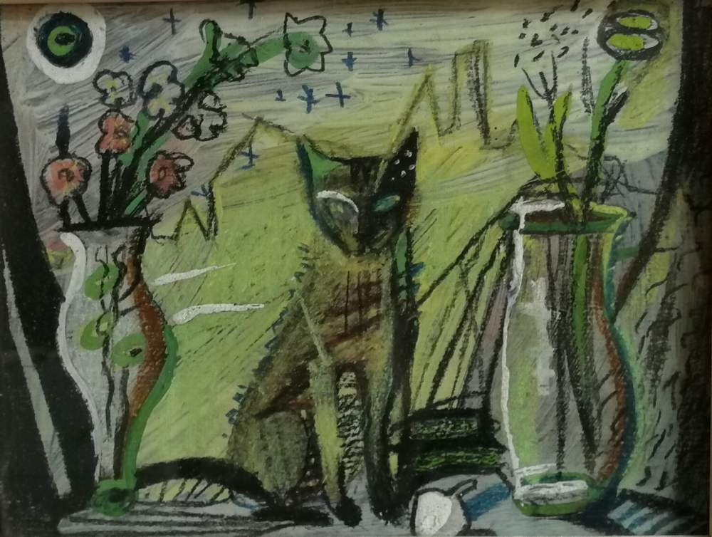 А когда-то, перед отъездом из Красноярска, мы купили в художественном салоне картину Румяны Внуковой под названием "Грусть", где в зелёных тонах сидит кошка в окружении ваз с цветами. И она висит в комнате дочери рядом с другими картинами.