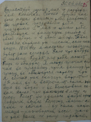 И долгожданный День Победы наступил. Клавдия с воодушевлением писала: «Поздравляю тебя, мой любимый Косточка, с долгожданным днём окончательной победы над врагом!!! Твой родной Харьков шлёт тебе привет и благодарит за весь твой пройденный, с такими трудностями, путь... путь, который привёл к такому желанному всем русским народом концу!!! ... Вчера 8 мая мы почти не работали. ...На улицах у репродукторов столько народа было, что машины с трудом пробирались на площадь. ... Ой, Косточка родненький! Ты, конечно, понимаешь, как радостно было! Во всех домах свет! Народ бежит, и все на площадь Дзержинского, и кто в чём выскочил, все взлохмаченные, все улыбаются и мурлыкают под нос какие-то песни. Дети с балконов кричат. Костик, у меня чуть сердце не выскочило! Если бы ты, Костик, видел, сколько шло народу по Сумской, и всё идут и идут и сами не знают, почему тянет на площадь ночью... Да просто и описать невозможно ту радость и чувство народа в сегодняшнюю ночь!».