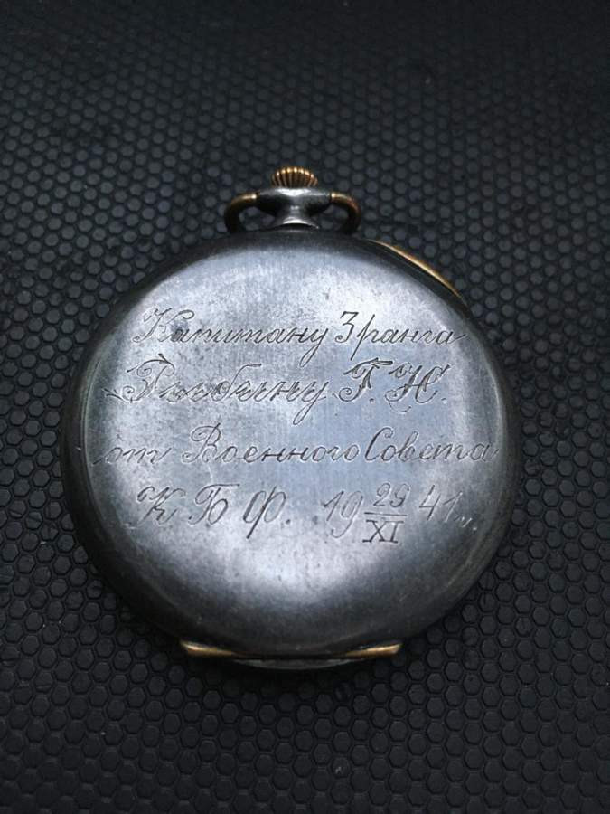 Ещё об одном деянии Г. Н. Рыбина говорит другой экспонат музея истории Петербурга. Это - наградные часы от Военного совета Балтийского флота. Ими Георгий Николаевич был награждён 29 ноября 1941 года за организацию геодезического обеспечения контрбатарейной борьбы флотской артиллерии против осадной артиллерии противника.