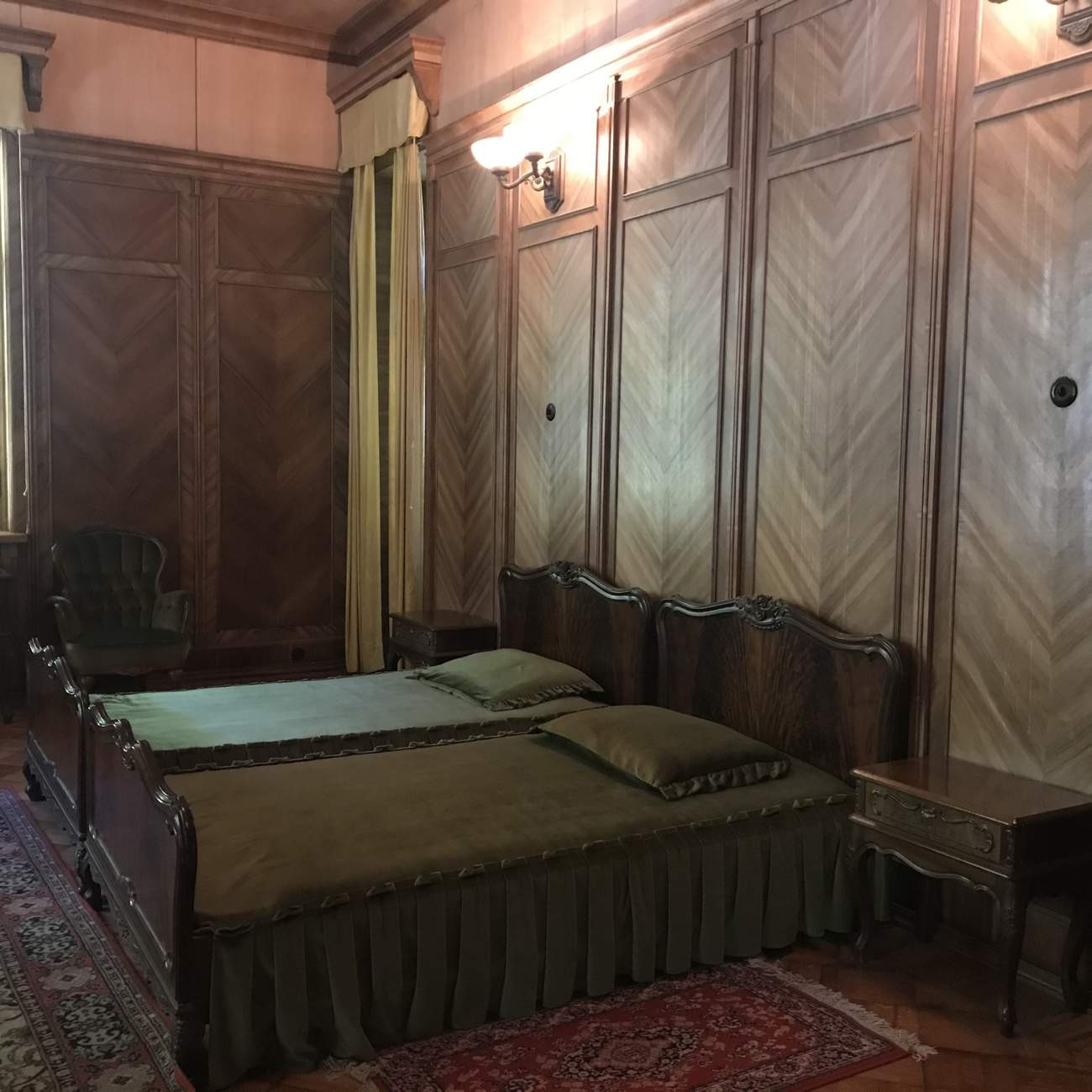 Здесь всё просто, но комфортно. Из "украшений" - рояль царской семьи Романовых и радиола. Все гостевые комнаты одинаковы - Сталин никогда не говорил, в какой именно он будет ночевать. Как не было у него постоянного места за большим обеденным столом.