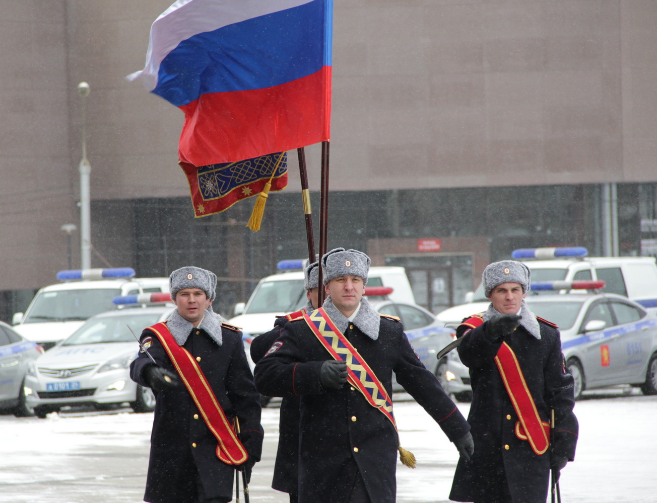 Затем прошёл гарнизонный развод. Полицейские прошли торжественным маршем по площади Мира, здесь же проехала техника, стоящая на вооружении полиции.