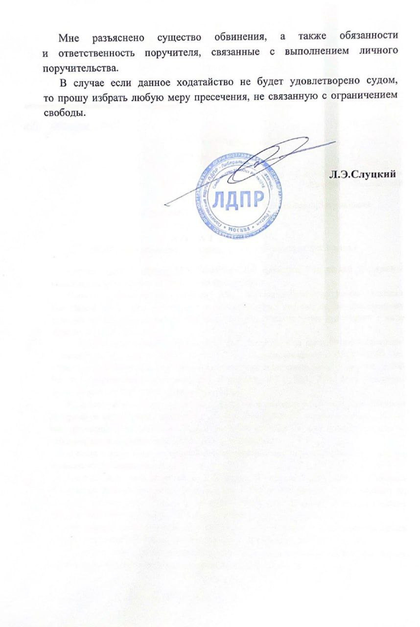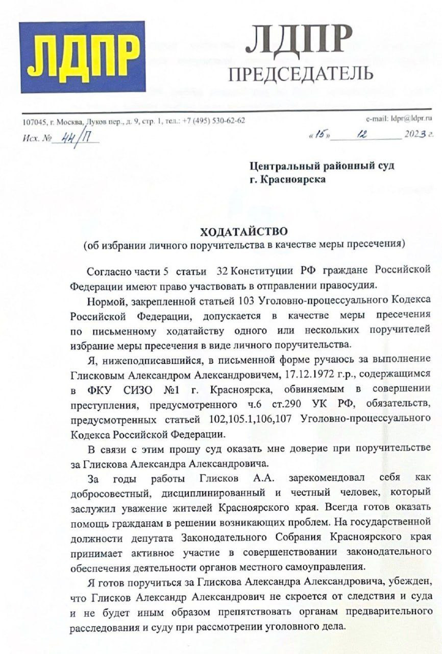 Документ опубликовал телеграм-канал "Глисков и команда". В своём ходатайстве Леонид Эдуардович просит суд назначить однопартийцу личное поручительство или любую другую меру пресечения, которая не предполагает лишения свободы. Слуцкий указал, что Александр Александрович зарекомендовал себя как честного, дисциплинированного и добросовестного человека. По мнению лидера ЛДПР, Глисков, находясь на свободе, не станет скрываться или препятствовать расследованию.