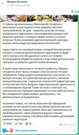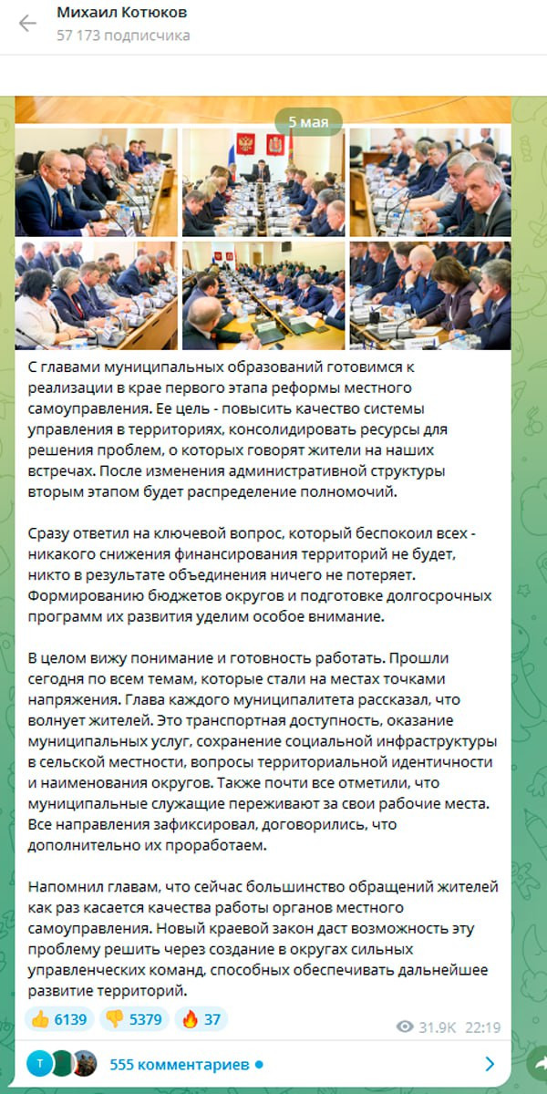 Тысячи лайков вдруг появились под публикацией губернатора Красноярского края Михаила Котюкова в Телеграм-канале, которая оправдывает муниципальную реформу в регионе, пишет "Сибирский Экспресс" и напоминает: жители уже вторую неделю записывают массовые обращения против законопроекта.