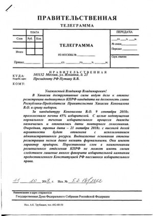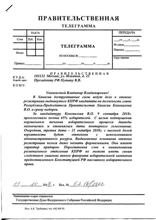 КПРФ решительно протестует против административно-командного произвола на выборах. Надеемся, уважаемый Владимир Владимирович, что Ваши слова о проведении честных и открытых выборов в Хакасии будут реализованы на практике".
