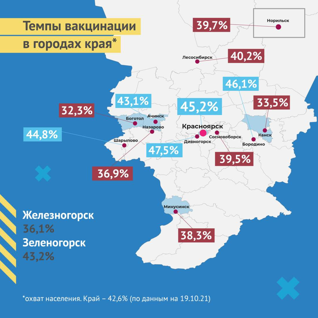 Среди городов по темпам вакцинации лидируют Дивногорск (47,5 процента), Бородино (46,1 процента), Шарыпово (44,8 процента). В Красноярске первый компонент поставили 400 тысяч человек. Полностью завершили курс вакцинации 377,5 тысячи жителей.