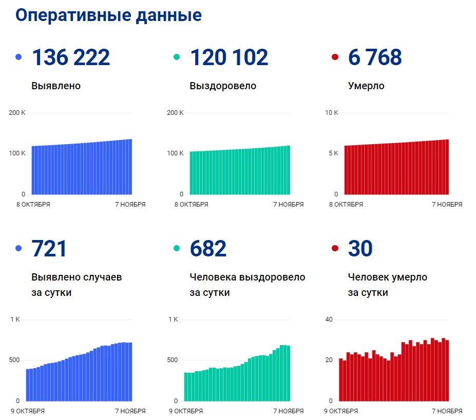 По состоянию на 14 часов 7 ноября в Красноярском крае зарегистрировано 136 222 лабораторно подтверждённых случая заболевания COVID-19, в том числе за последние сутки — 721.