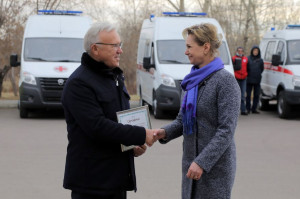 "Сегодня мы передали медикам 48 новых машин скорой помощи, приобретённых на средства федерального и краевого бюджетов. Это хорошо оснащённые, мощные автомобили высокой проходимости, готовые к любым условиям и задачам. Они будут работать в наших городах и сёлах от Минусинска до Игарки. За счёт бюджета в крае ежегодно обновляется от пяти до десяти процентов санитарного автопарка. Всего в этом году система здравоохранения региона получит в полтора раза больше транспортных средств, чем в прошлом. Это не только микроавтобусы скорой помощи, но и легковые "Нивы", "Лады" для сельских врачей и фельдшеров", - рассказал Александр Усс.