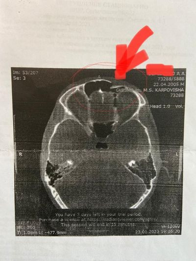 Об этом случае рассказали врачи Красноярской межрайонной детской больницы №4. Мальчик бежал к автобусу, поскользнулся, упал и ударился лбом о тупой ограничитель на тротуаре. Ребёнка сперва доставили в БСМП, где его осмотрел нейрохирург. По результатам компьютерной томографии был выявлен вдавленный перелом передней стенки левой лобной пазухи с попаданием обломков в её полость.