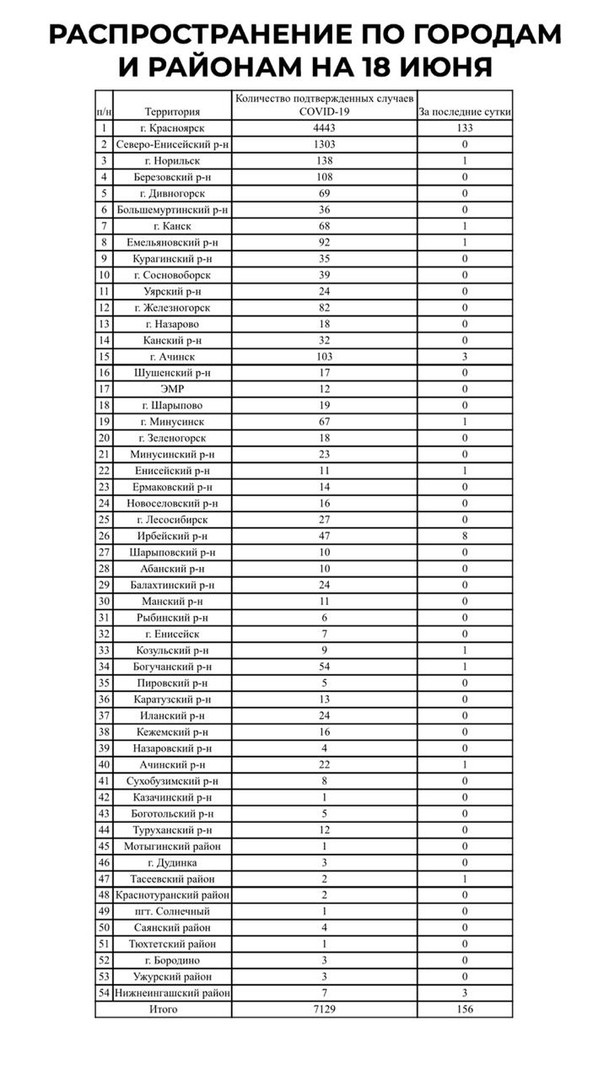 По данным регионального управления Роспотребнадзора на 18 июня, в Красноярском крае зарегистрировано 7 129 лабораторно подтверждённых случаев заболевания COVID-19 на 54 территориях края, в том числе за последние сутки зарегистрировано 156 случаев заболевания.