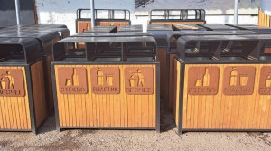 Изготовлены они в управлении зелёного строительства. Каркас выполнен из металла, щиты из сосны обработаны на станках, отшлифованы и покрыты маслом. Каждая урна имеет три отсека: для стекла, пластика и прочих отходов.