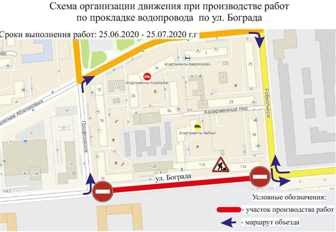 С 25 июня по 25 июля закроют сквозное движение по ул. Бограда от ул. Робеспьера до ул. Профсоюзов. Объезд будет осуществляться по ул. Профсоюзов, Красной площади и Робеспьера.