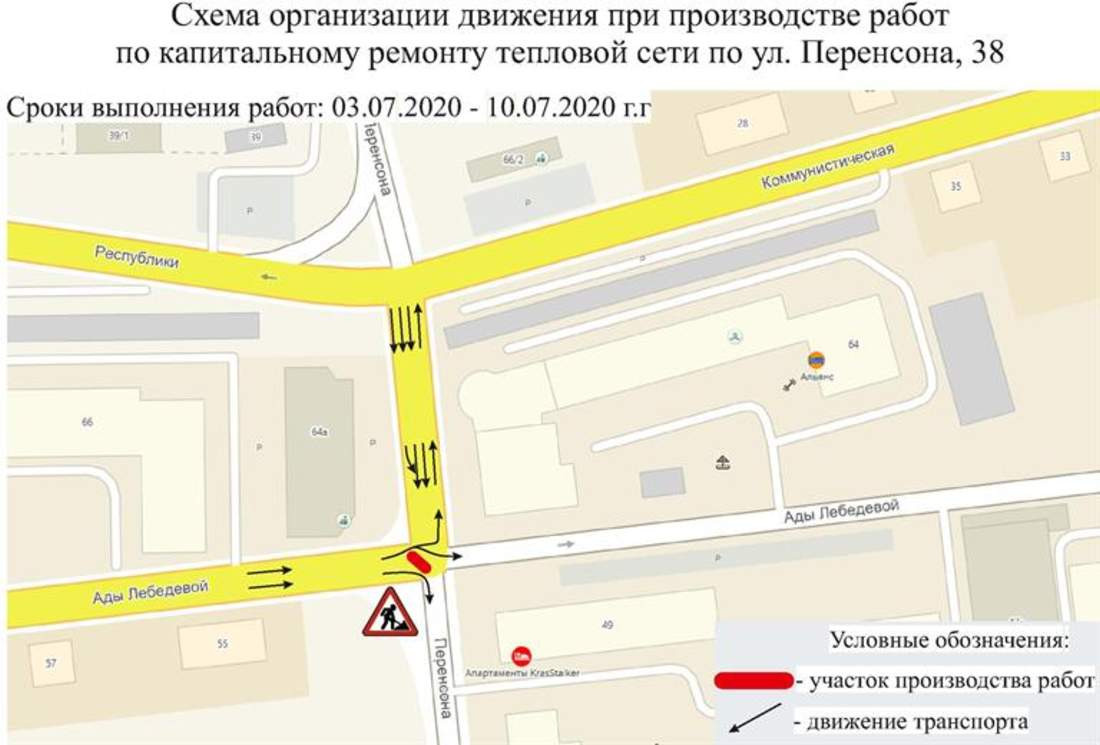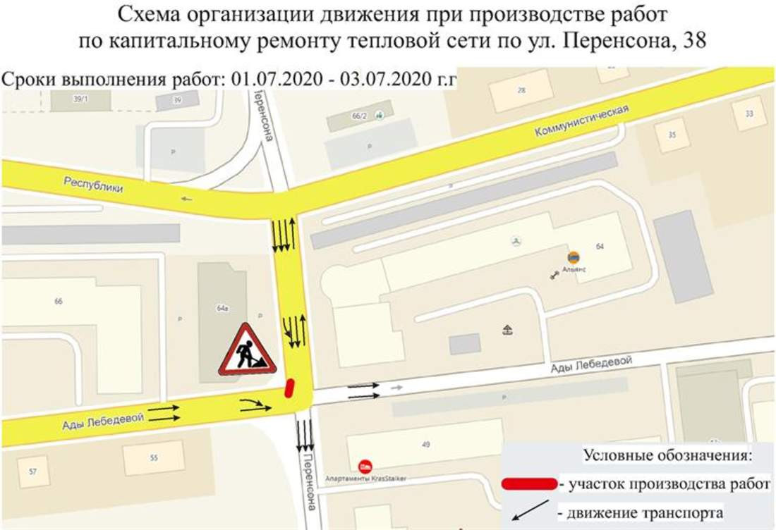 Также будет ограничено движение на перекрестке ул. Перенсона и Лебедевой. Проезжая часть здесь будет сужена до одной полосы как по ул. Перенсона, так и по ул. Лебедевой. Ограничения пройдут в два этапа: с 1 по 3 июля и с 3 по 10 июля.
