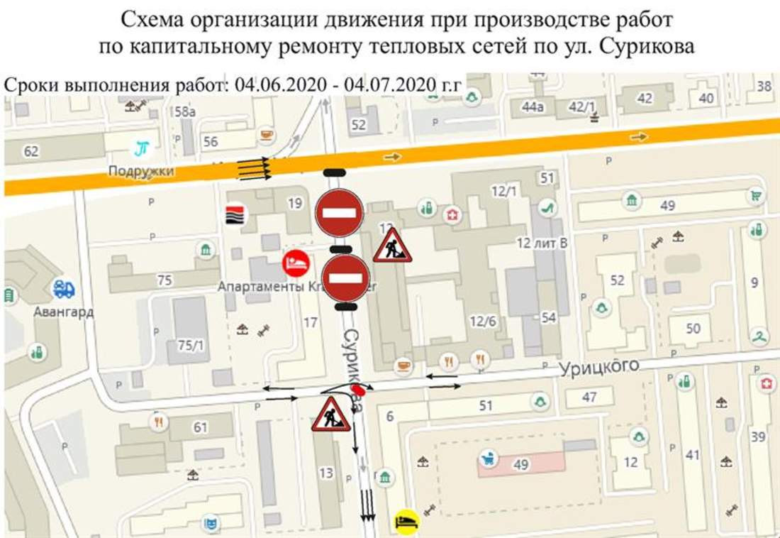 Сквозное движение по ул. Сурикова на участке от ул. К. Маркса до ул. Урицкого также будет закрыто с 4 июня по 4 июля.